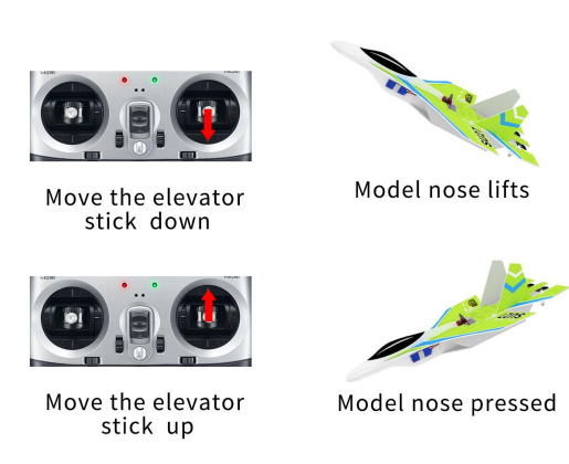 Move the elevator stick down, the movement direction of the ailerons and tailerons is reversed | Elevator mix control reversed | Short press the button twice | Green LED of CH2 on/off |