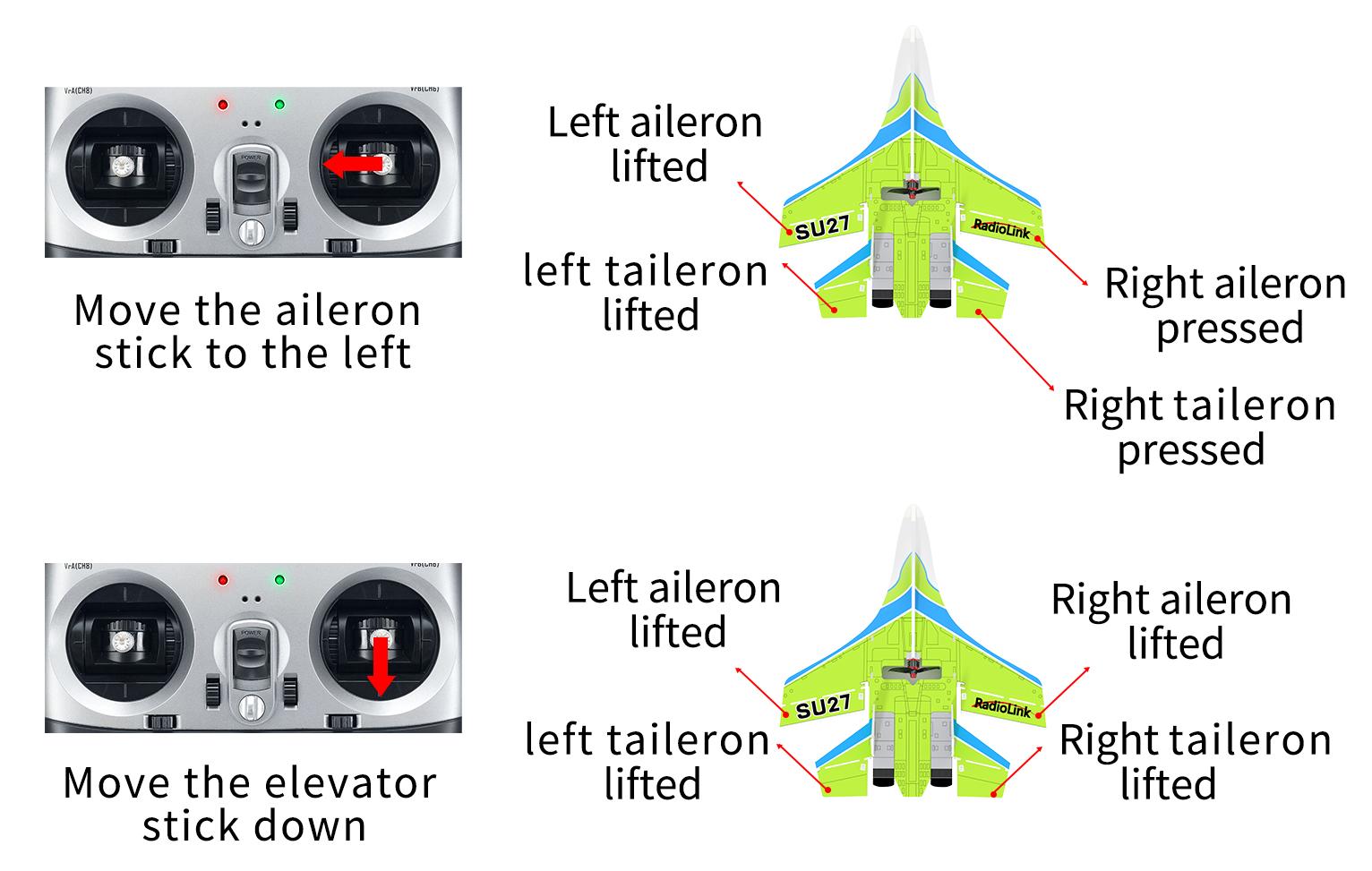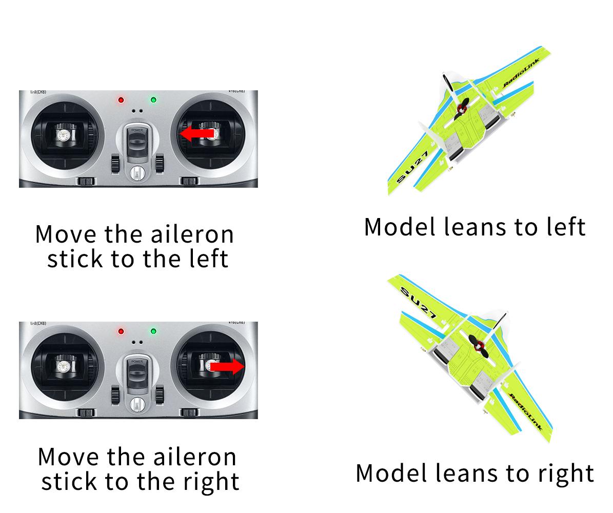 Move the aileron stick to the left, the movement direction of the ailerons and tailerons is reversed | Aileron mix control reversed | Short press the button once | Green LED of CH1 on/off |