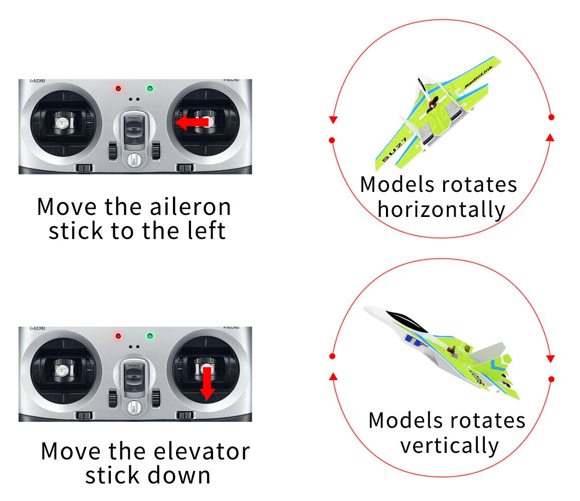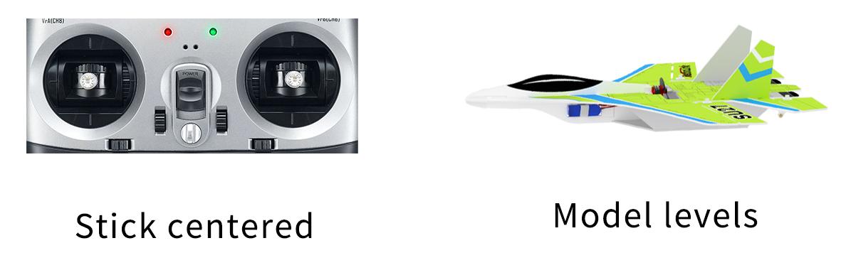 The model attitude (inclination angles) is controlled by joysticks. When the joystick is back to central point, the aircraft will level. The max inclination angle is 70° for rolling while that for pitching is 45°.