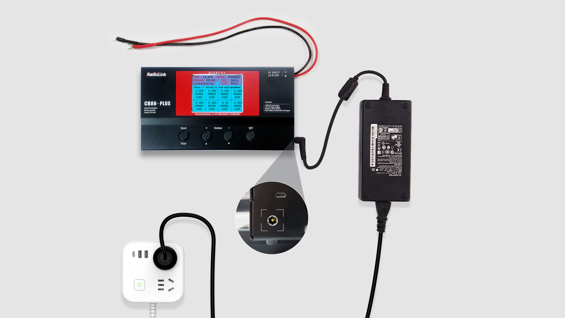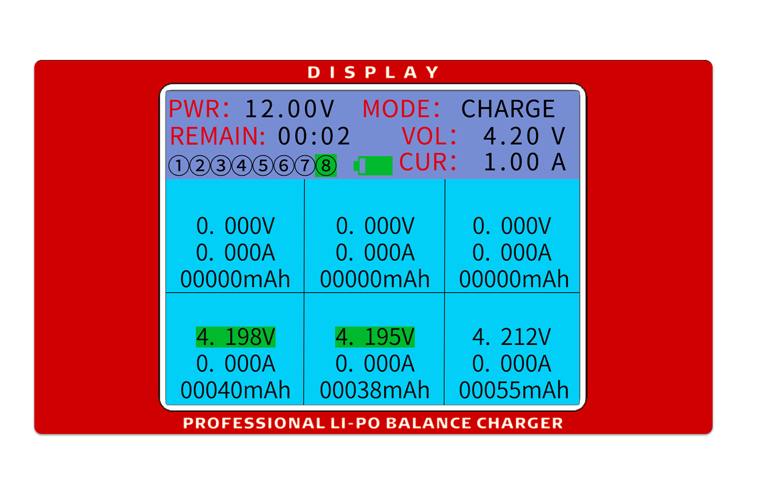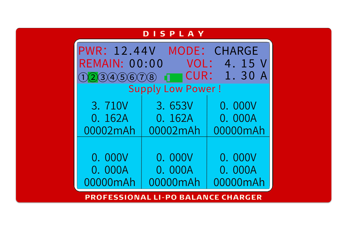 8个充电端口,每个充电端口最高支持6S电池充电。集成保姆,设定充电参数后自动扫描所有电池充电端口,自动轮流或者按照设定的充电顺序给各个充电端口的电池充放电。