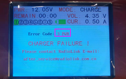 Note: After the calibration, you need to check whether power supply voltage and battery voltage are consistent with the actual calibration value. If there is a big difference in the voltage value, you need to re-calibrate the charger with a multi-meter.Q: After upgrading the newest firmware, an error code shows **V (such as 3V, 145V, 23456V). What does error code **V mean?