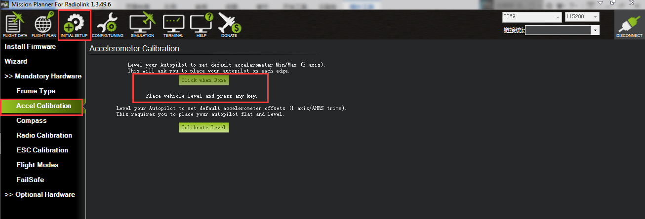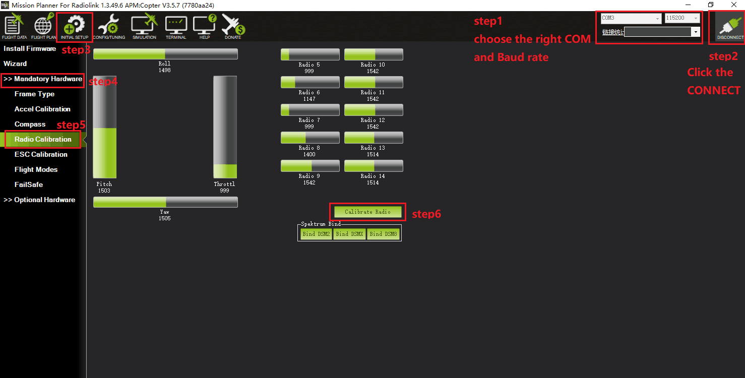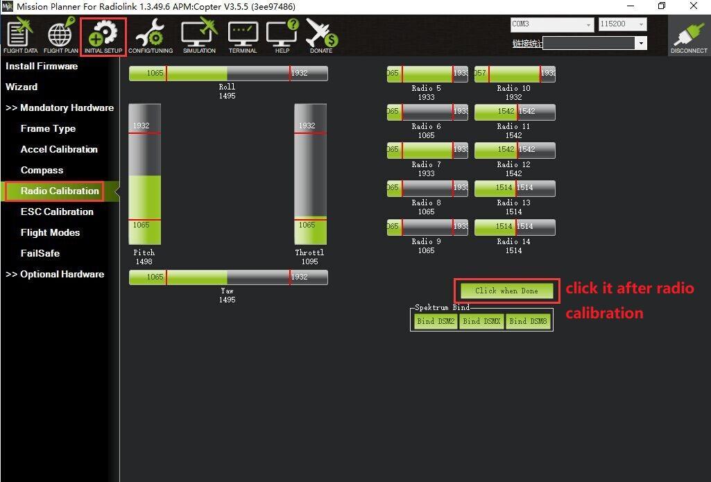 Connect Mission Planner to AutoPilot, and then connect receiver to AutoPilot to finish the calibration of transmitter, Accelerometer and compass.