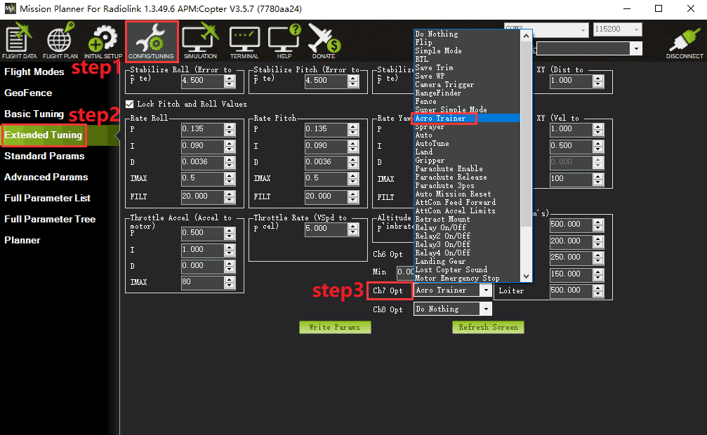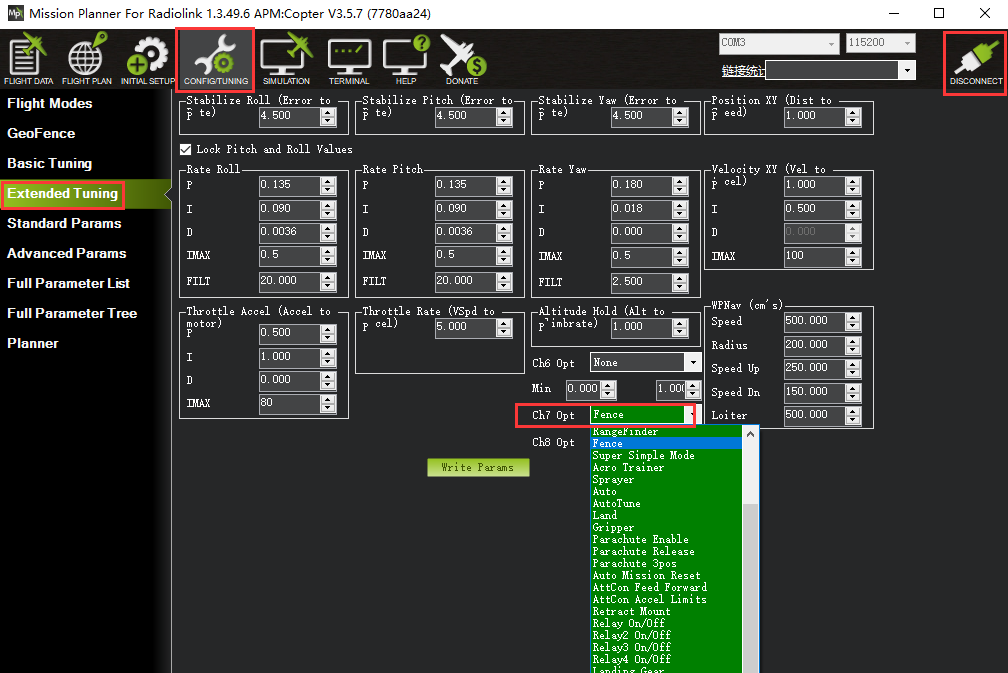 1. Go to the Mission Planner’s Config/Tuning > Extended Tuning screen and set either “Ch7 Opt” OR “Ch8 Opt” to Fence.