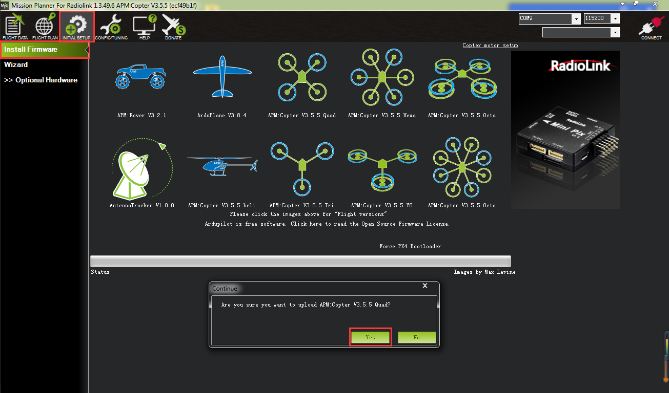 Please connect your crossflight and computer via USB cable. Open the Mission Planner to loading the firmware you need to your crossflight.
