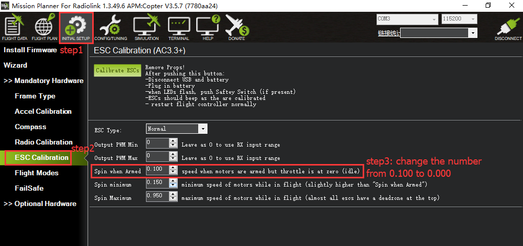 After upgrade firmware 3.1 or after version 3.1, there will be a pop-up warning motors will run at idle speed after disarmed.