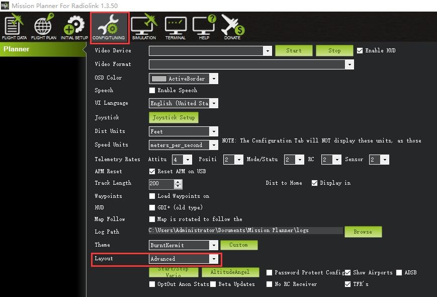A: When any of the above three problems encountered during the connection to RadioLink Mission Planner and trying to flash the latest firmwares, modify LAYOUT from BASIC TO ADVANCED as below shown