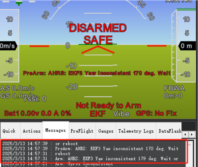 CrossFlight is flashed with ArduPilot airplane firmware. It cannot be armed after all calibrations are complete. There is a PreArm message: AHRS: EKF3 Yaw inconsistent xx deg. Wait or reboot (As shown below). How to fix it?