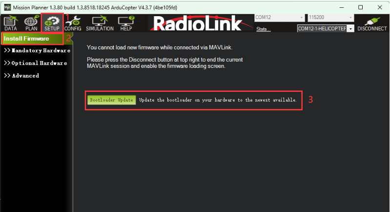 2.After updating the firmware in QGroundControl, open RadioLink Mission Planner or ArduPilot Mission Planner. connect CrossFlight to RadioLink Mission Planner or ArduPilot Mission Planner, and click Bootloader Update.