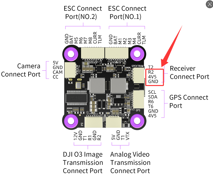 Connect the signal line of the ESC to any solder joint of M1~M8. Connect the positive and negative poles to the battery, and the battery will directly power the ESC. Please refer to the picture below:
