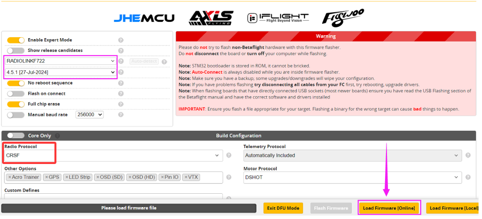 Step 1: Please open Betaflight configurator. Set Radio Protocol to SBUS before loading online firmware, as shown below: