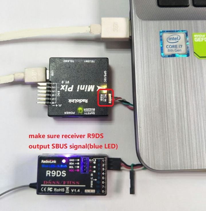 Connect Mission Planner to AutoPilot, and then connect receiver to AutoPilot to finish the calibration of transmitter, Accelerometer and compass.