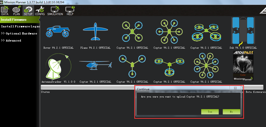 Once the installation of Mission Planner and driver is done, there will several pop-ups when you open the MP at the first time. The first pop-up clicks Yes and the others click NO.
