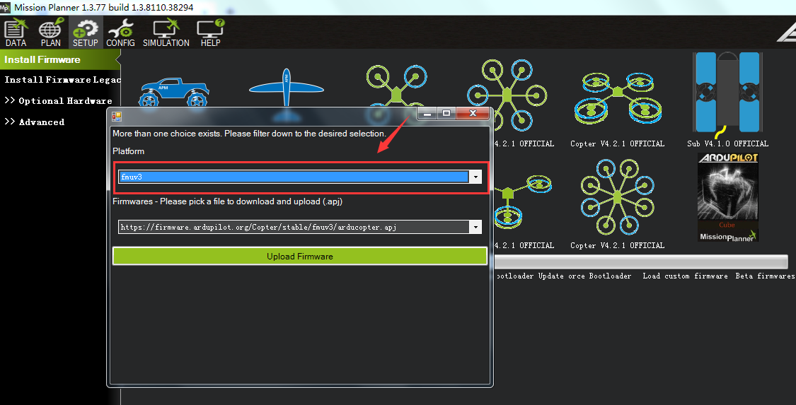 1. Install firmware: It is to flash the firmware online. Click the model icon in this interface, and MP will automatically download the firmware and upload it to the flight controller.