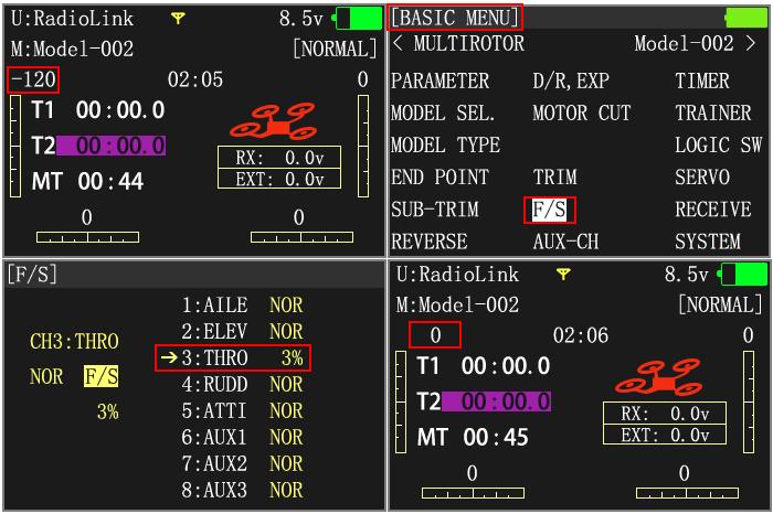 2. Hold throttle at minimum and rudder to the left for 2 seconds till the propeller stop to spin.
