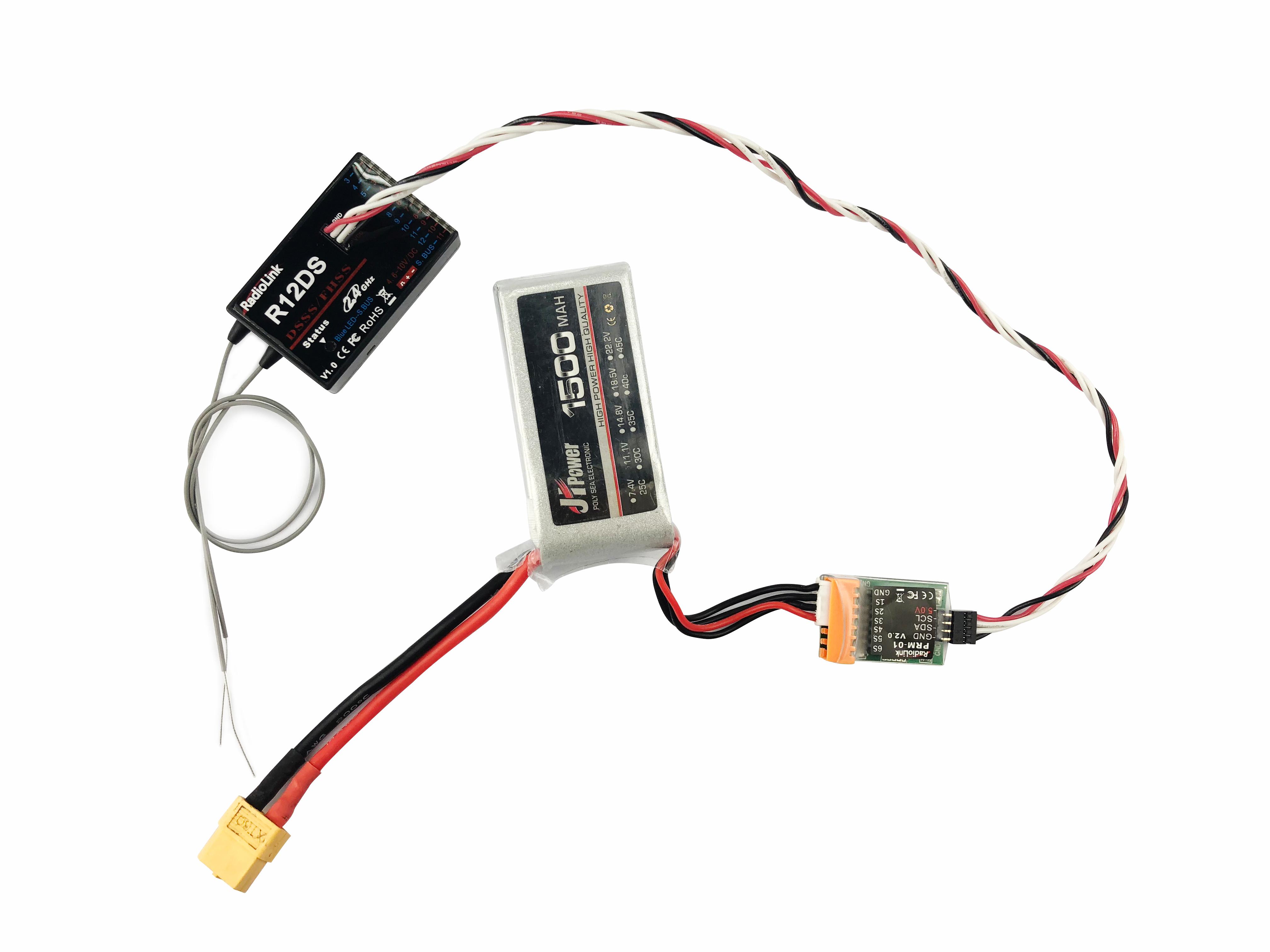 Note: Please power on all the equipment first, especially the plane. And then connect the PRM-01 to the receiver to protect the PRM-01 in case the instantaneous current is too much to burns the telemetry module.