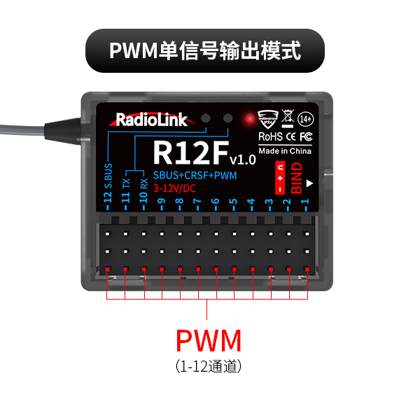 PWM单信号输出模式:接收机红色指示灯常亮时,1-12通道输出PWM信号。