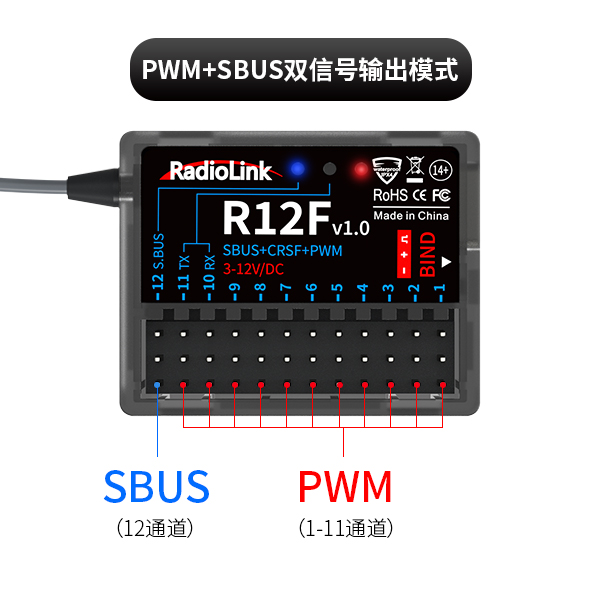 PWM+SBUS双信号输出模式:接收机蓝色和红色指示灯同时常亮时,1-11通道输出PWM信号的同时在第12通道输出SBUS信号。