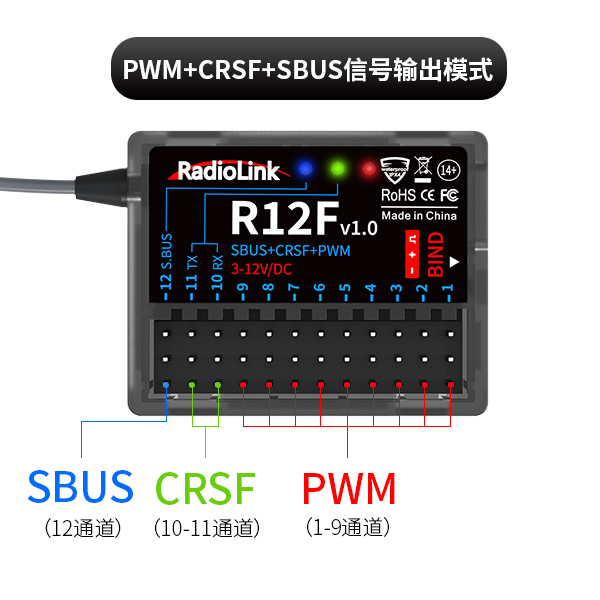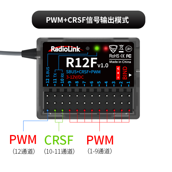 CRSF+PWM信号输出模式:接收机绿色和红色指示灯同时常亮时,1-9、12通道输出PWM信号,10-11通道输出CRSF协议。