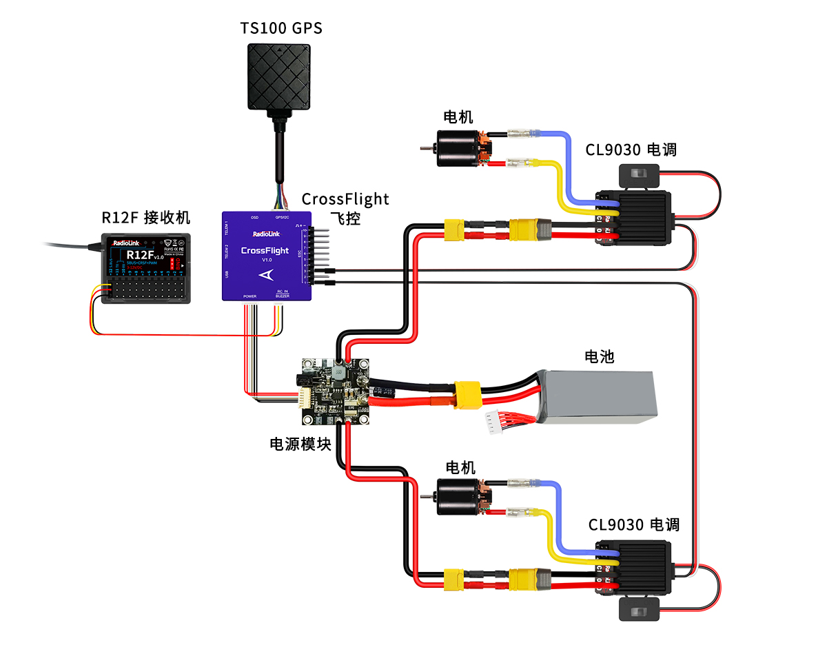用户根据需要选择单PWM信号输出模式或者PWM+SBUS双信号输出模式,结合飞控实现打窝船远航、模型车FPV趣味竞赛或者固定翼远航等。