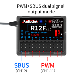 CH1 to CH11 output PWM signal output while CH12 outputs SBUS signal.