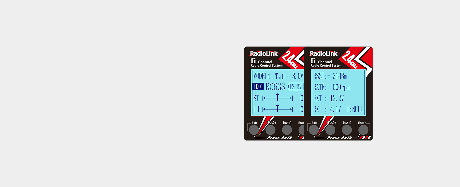 Capable of real-time transmission of RSSI, receiver, and model voltage. The RSSI value and receiver voltage will display on the screen once the binding complete between transmitter and receiver.