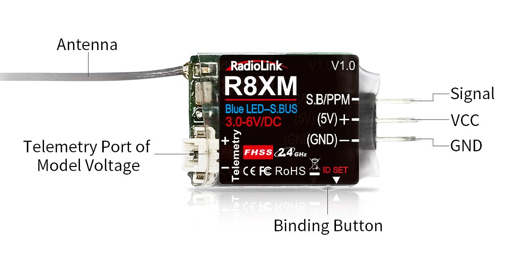 Each receiver has an individual ID code and must bind with transmitter before using. When the binding is done, the ID code will be stored in the transmitter and there’s no need to rebind. Therefore, when a new R8XM is purchased, binding needs to be done in order to work with transmitter. (Note: R8XM is not compatible with T8FB produced before December 2016) .