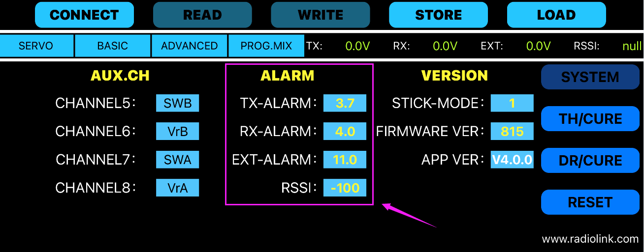 When the returned RSSI, receiver voltage, and model voltage are lower than the set alarm value, the transmitter will emit alarm tone: