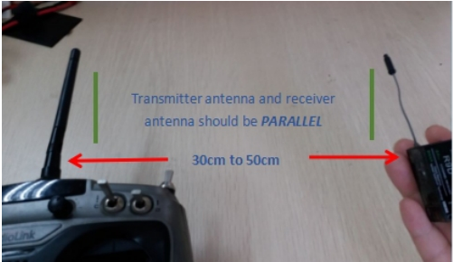 ① Power on the transmitter and receiver with both antennas parallel and straight and within the distance of 30cm.