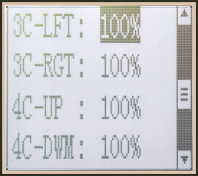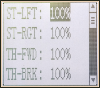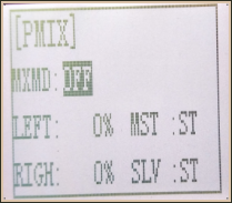 Select the setting item "RGHT", "BRAK", or "DOWN"(These setup items are different depend on the master channel.ST:"RGHT"; TH:"BRAK";CH3:"DOWN") by pressing “Dec(-)” or “Inc(+)” button. Press“Enter”key,the initial value of "RGHT", "BRAK", or "DOWN" will blink, Use“Dec(-)”or“Inc(+)”button to adjust the right, brake, or down side mixing amount.