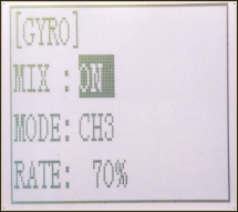When MIX set OFF, gyro is disabled while when MIX set ON, you can adjust gyro sensitivity STD or CH3. STD is adjusted on screen and CH3 can be adjusted by VR button. CH3 is defaulted by VR switch.