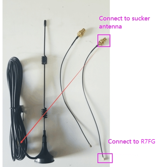 The antenna connector of the R7FG receiver is IPEX. Make sure the sucker antenna has the IPEX connector. Please refer to the picture below: