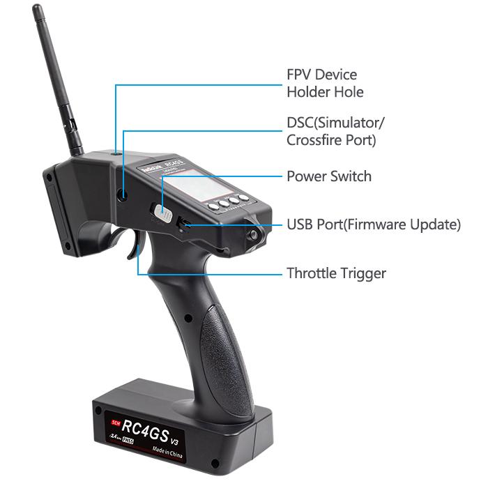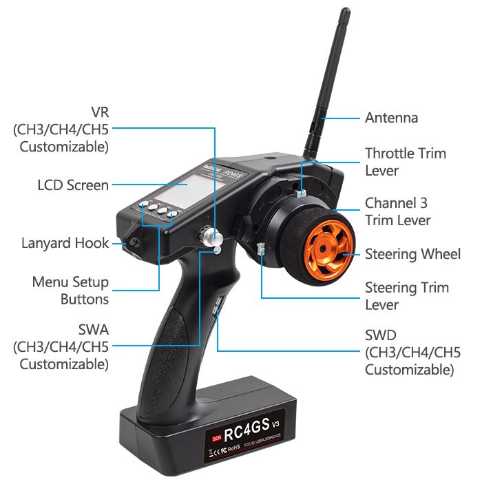 TH | Throttle trigger | Default control channel 2 throttle. Customizable to control other channels |