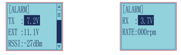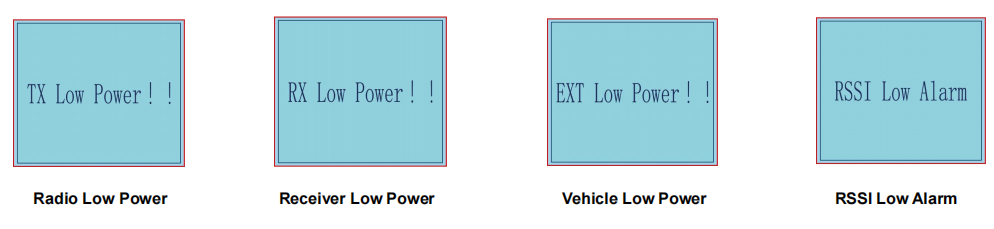 When the voltage of the transmitter, receiver, vehicle battery, and RSSI signal strength are lower than the set value, there will be a text displayed on the transmitter screen(See Pictures below) and a "didi" sound dual alarm prompt to remind you.