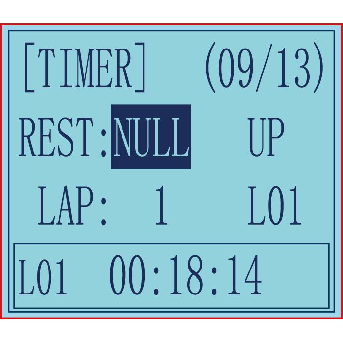L01-L30 can be selected. For example, when it is L02, the timing below correspond to Lap 2. When the number of laps set is greater than 1, the number of laps will automatically increase by 1 lap each time it stops.