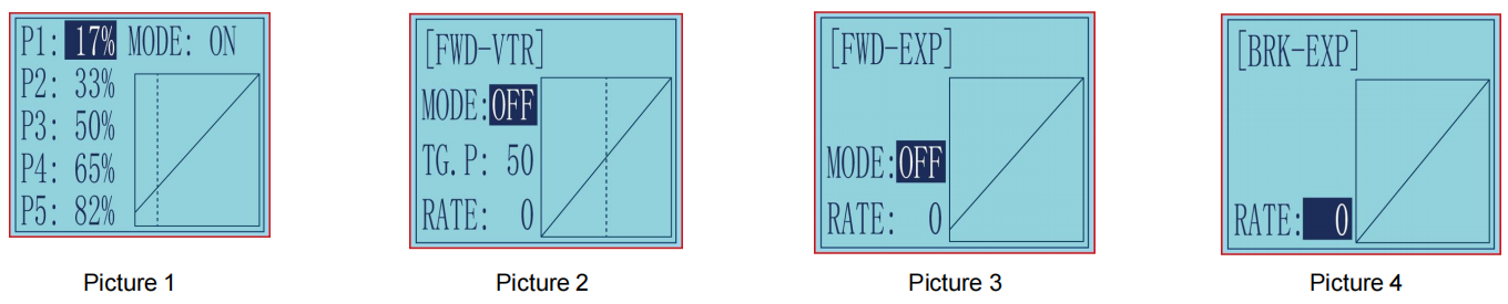 Select the setting item "RGHT", "BRAK", or "DOWN"(These setup items are different depend on the master channel.ST:"RGHT"; TH:"BRAK";CH3:"DOWN") by pressing “Dec(-)” or “Inc(+)” button.