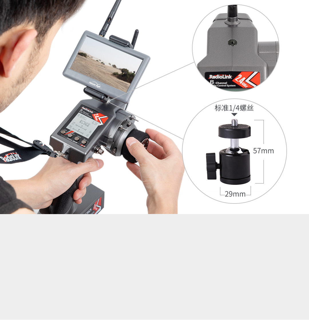 An aperture of FPV display holder: M6 thread (1/4 thread) (English screw)
