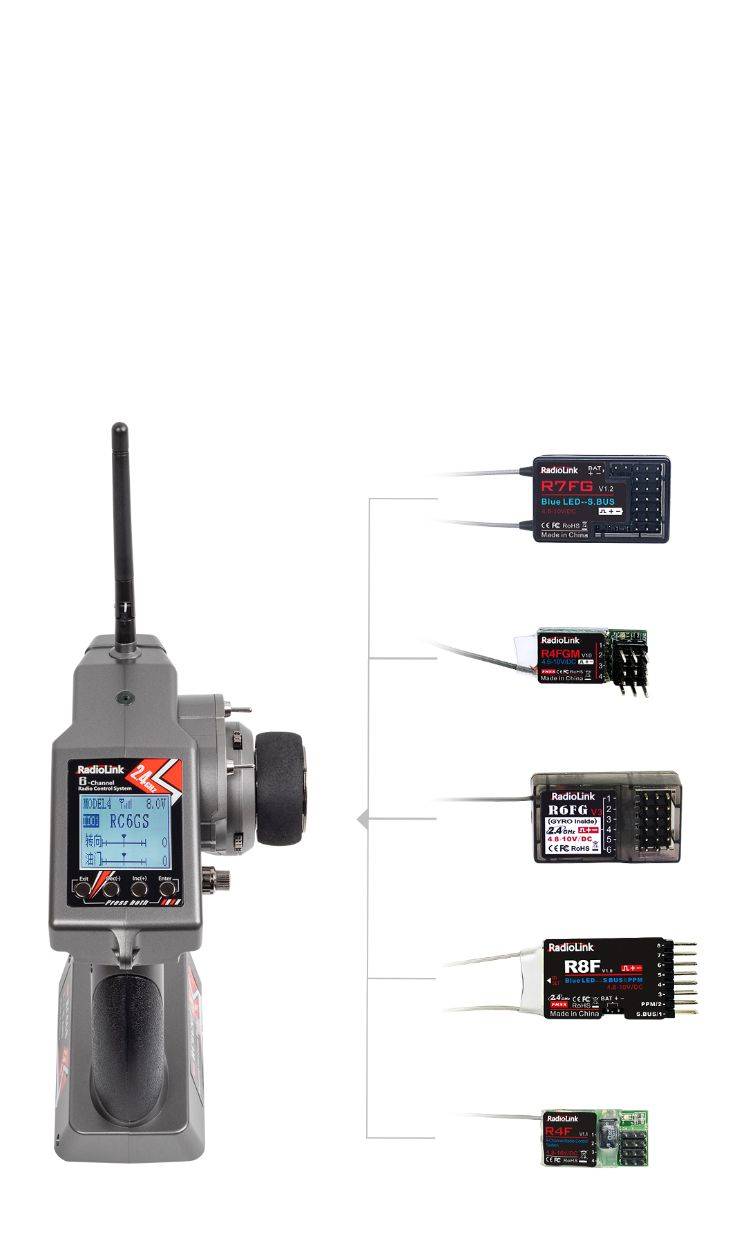 RC6GS V2 is also compatible with the 4 channels mini receivers R4FGM/R4F designed for Mini RC cars, the 6 channels receivers R6FG/R6F, and the 8 channels long control distance receivers R8EF/R8F, which designed for RC boats.