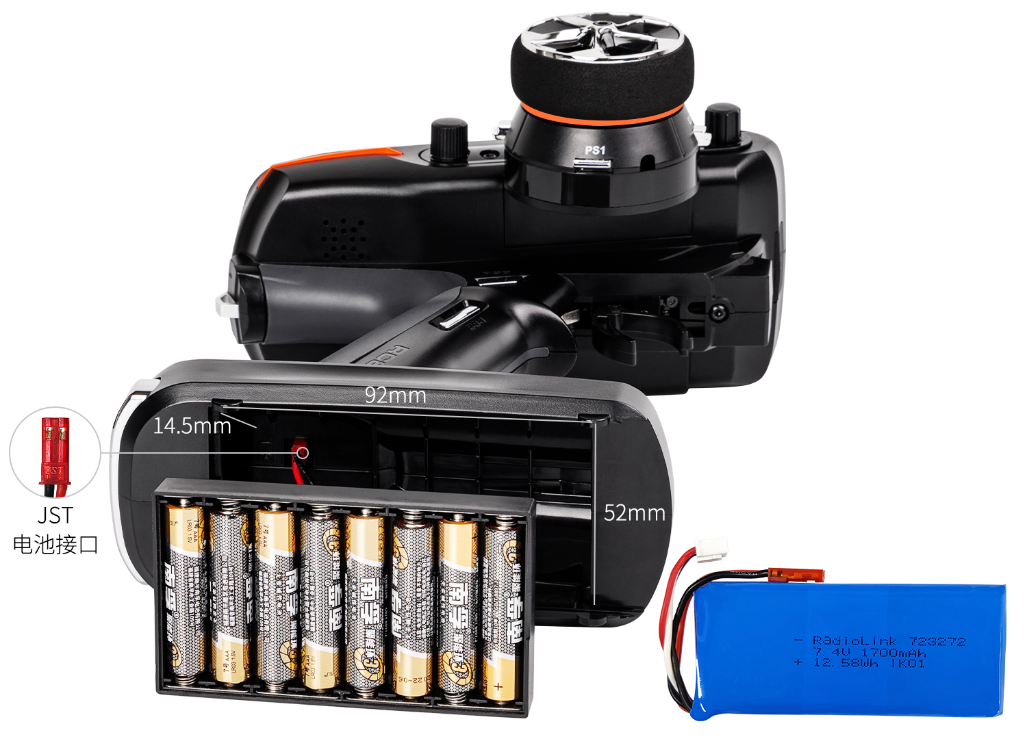 采用通用JST 电池接口,支持6S镍氢电池、2S-4S锂电池、8节7号电池或者通过Type-C连接线连接至电脑或者充电宝供电;