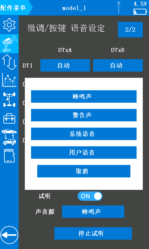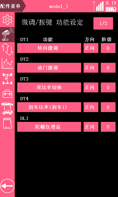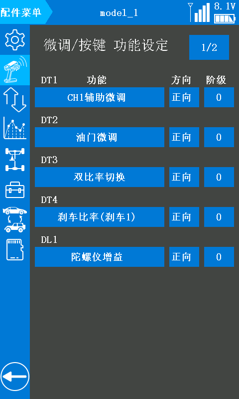 两种方式设置陀螺仪感度,便捷顺心,让陀螺仪自稳功能发挥更出色。可通过“陀螺仪混控菜单”或者编码开关DL1来快速开启或关闭陀螺仪感度。