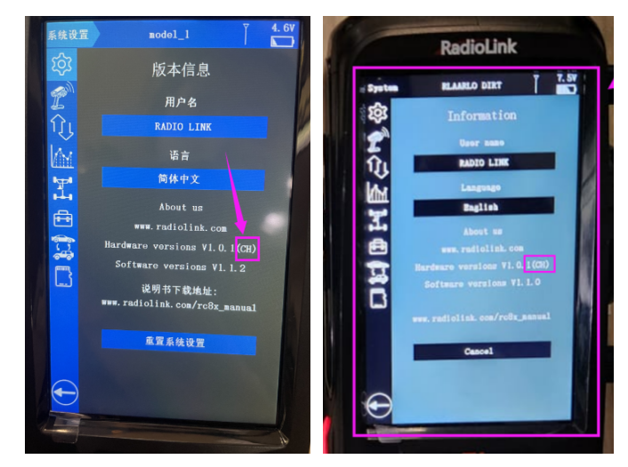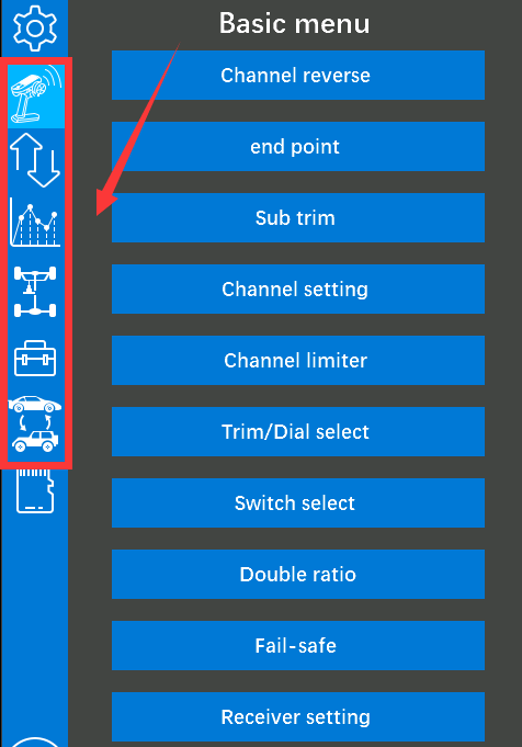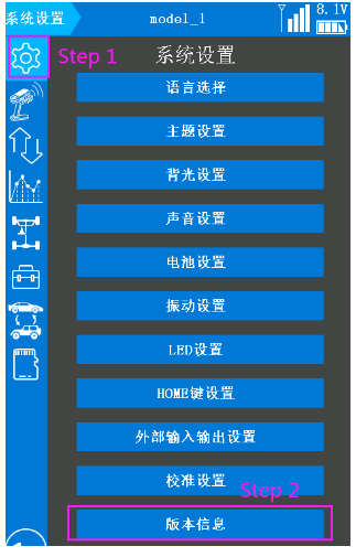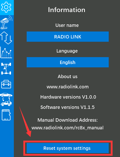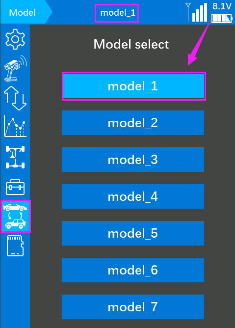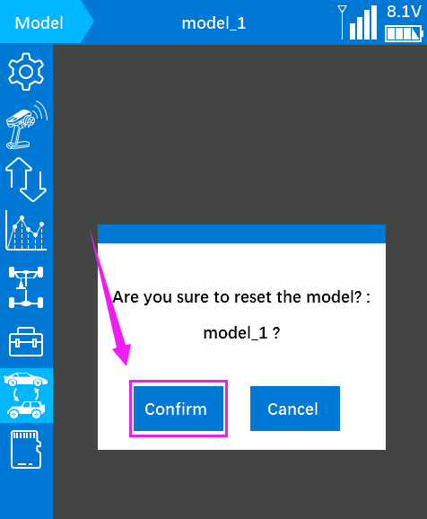 1.Reset the current model. View the current model on the RC8X taskbar, then enter model select, select the current model, and click reset.