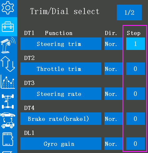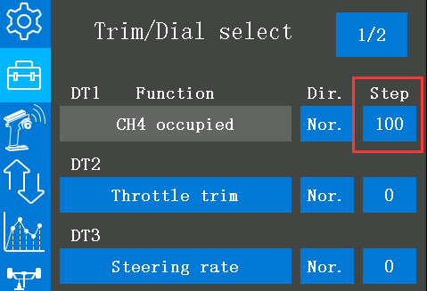 2. Enter the "Trim/Dial select" menu, and set the step of the corresponding DT button to 100, so that every time the DT button is toggled, the travel amount will go directly to 100. You can also set different values according to your needs.