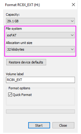 Note: If you need to format the RC8X SD card (RC8X_EXT), please refer to the following picture to set the SD card parameters and then format it.