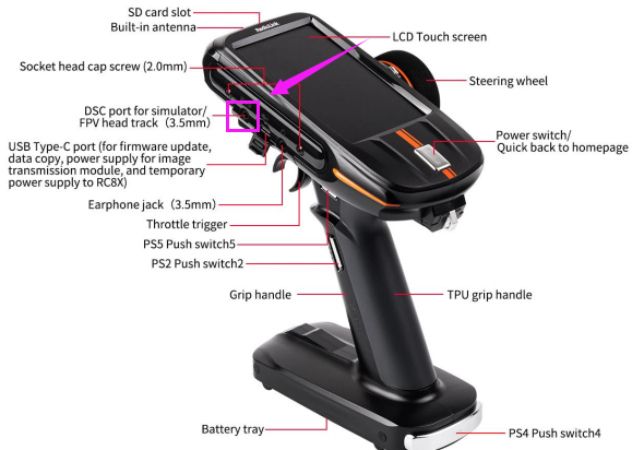 PS5 | Push Switch 5 | Default control CH5, can be programmed | Two PS5 switches on the left and right side, convenient for left and right-handed users |