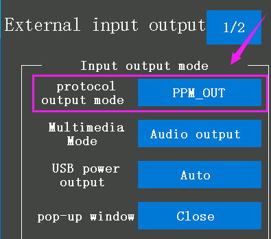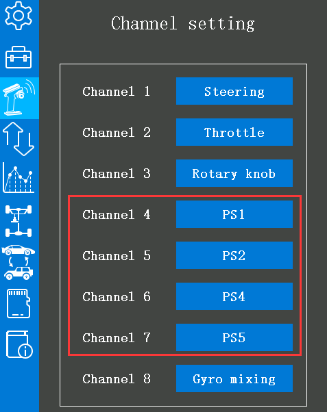 1. Select any one of the PS1/PS2/PS3/PS4/PS5/Steering switch/Trigger switches for the channel to be set in the "Channel Setting" menu (The switches of channel 4 to channel 7 are PS1/ PS2/PS4 /PS5 by default, see picture below);