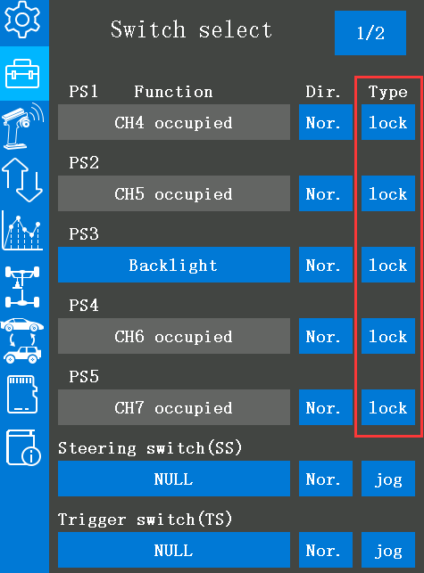 2. Enter the "Switch select" menu, and set the “Type” of the corresponding switch to “lock”, so that when you press the switch once, the channel output will jump from the initial value to the maximum value (or minimum value); press the switch again, the channel output will jump to the minimum value (or maximum value).