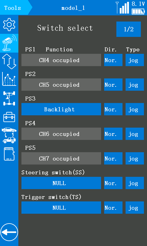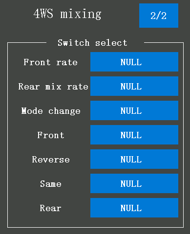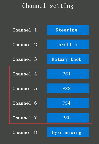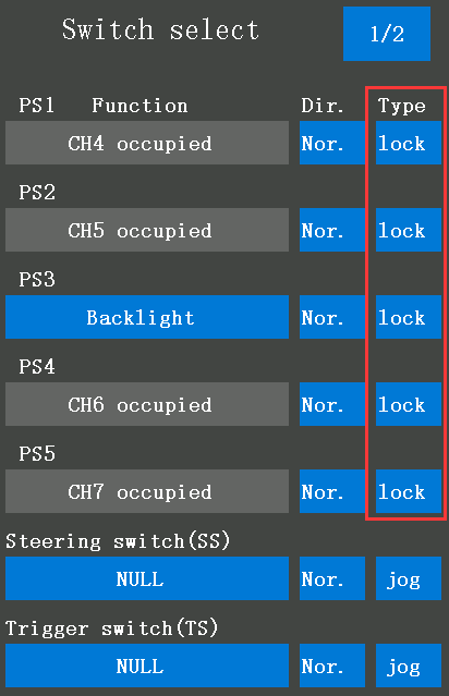 PS1, PS2, PS3, PS4, PS5, Steering switch, and Trigger switch can be used as 2-position switches by setting. The setting method is as follows:
