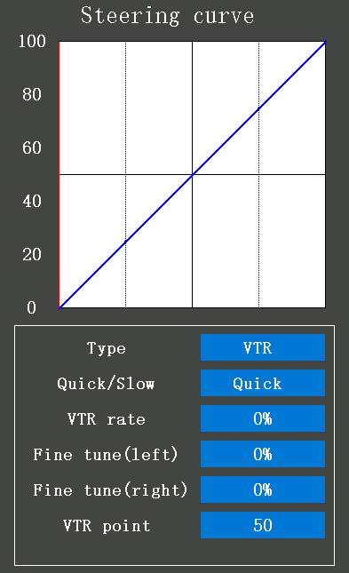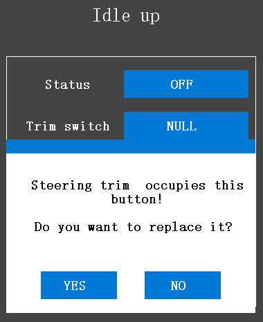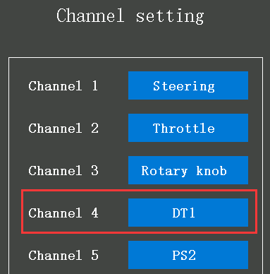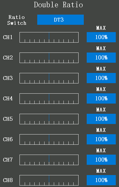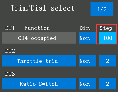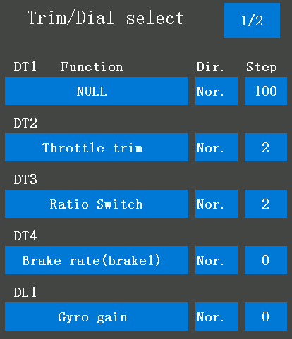 DT1 | Digital Trim 1 | default steering trim | Push the button forward or backward to adjust the value. Restore to factory settings by pushing the buttons. Four DT buttons can work as four 3 position switches by setting. Please refer to chapter 1.2.8 Three Position Switch. |