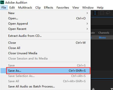 (1) Import the voice file whose format needs to be modified into Adobe Audition software, and then click File - Save As.