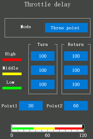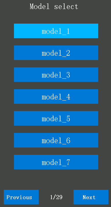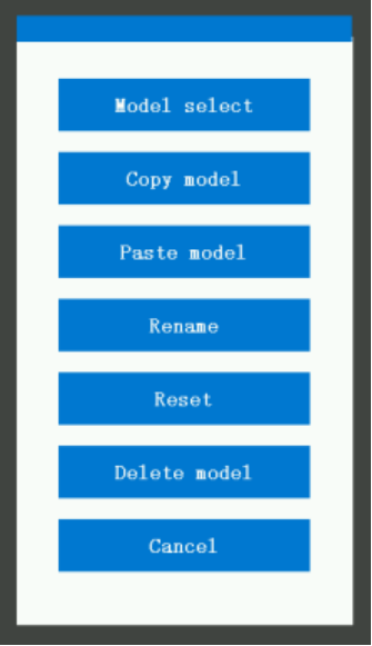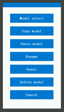 ① The current model name. 200 models in total can be selected in the Model select menu. Make sure the model name on the display is consistent with the actual model before running. If the model name is not consistent with the actual model, the movement of the servo, the steering gear action, and the neutral position setting will be wrong, which may damage the car.