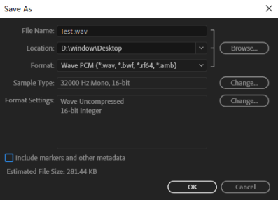 (2) Modify the voice file format to ensure that the format conforms to WAV format, Sample rate 16KHZ or 32KHZ, monophonic, and 16 bits depth. After selecting the save location, click OK, and a qualified voice file will be generated.